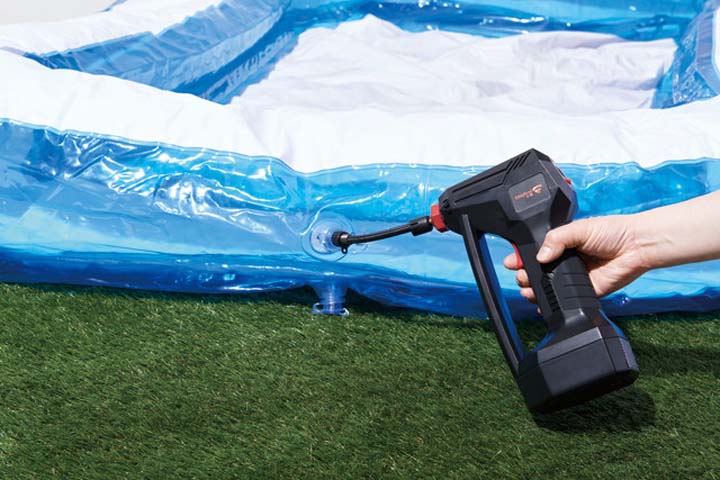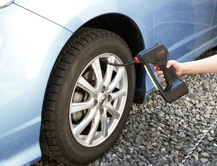 自転車、車、ボール、プールなど様々なものに空気を入れることができるコードレス型エアコンプレッサー・充電式で、小型軽量で片手でもラクラク。