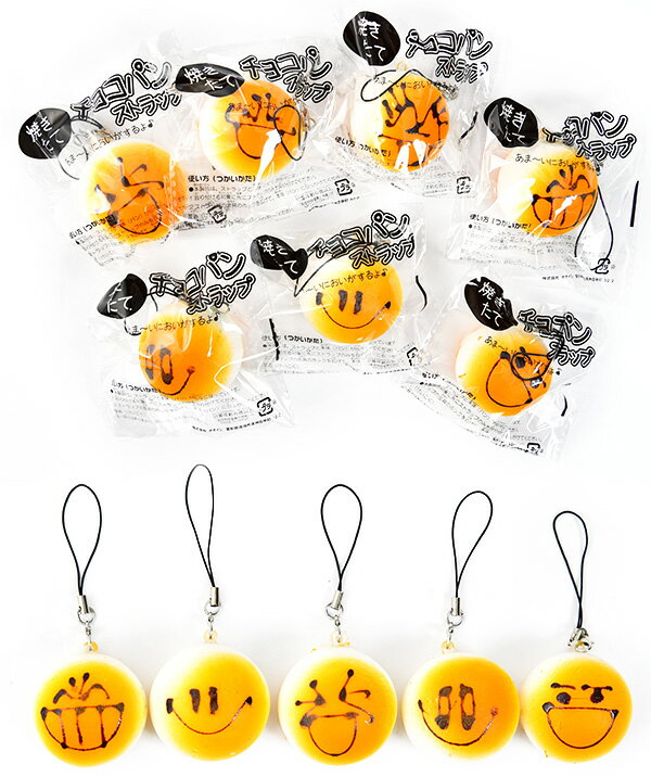 様々な表情がデザインされたスクイーズ風のチョコパンストラップです。