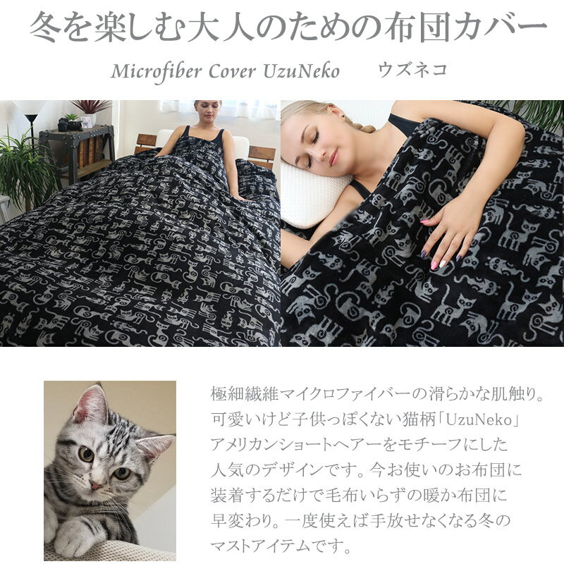 ねこ柄掛け布団カバー UzuNeko セミダブル マイクロファイバー 猫柄 うずねこ ウズネコ あったか 暖かい かわいい 可愛い 猫好き ふわふわ にゃんこ おしゃれ 毛布 スナップボタン モノトーン