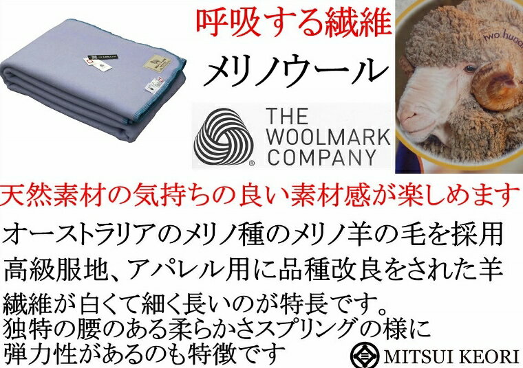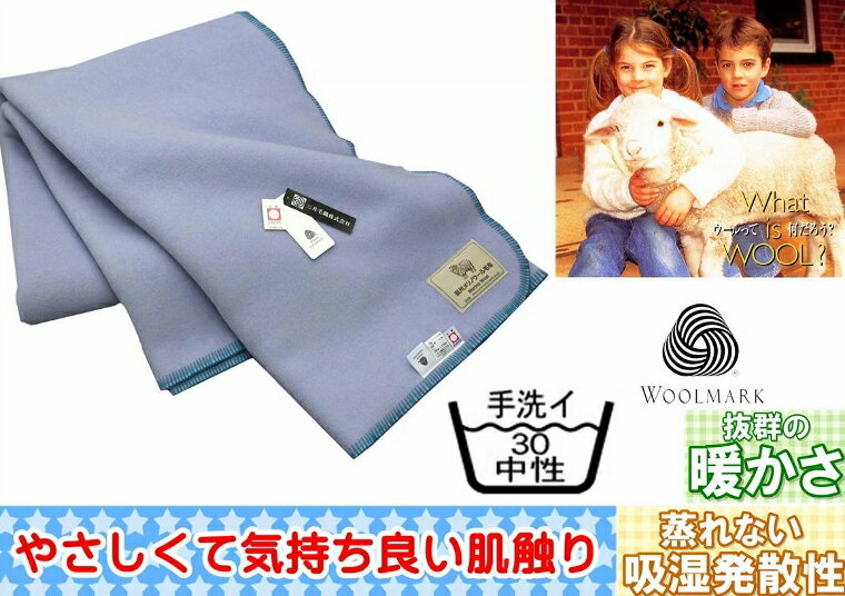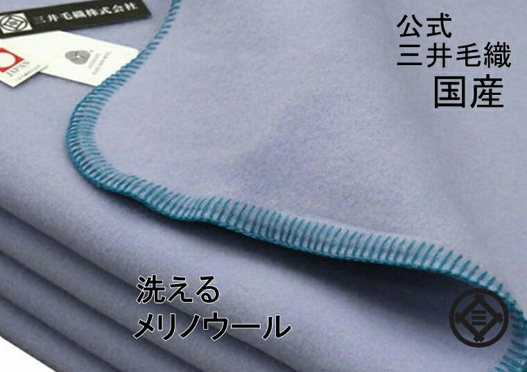 洗える メリノ ウール毛布 (毛羽部) セミダブルサイズ 160x210cm ウールマーク付 公式三井毛織国産 ブルー色 送料無料 W500